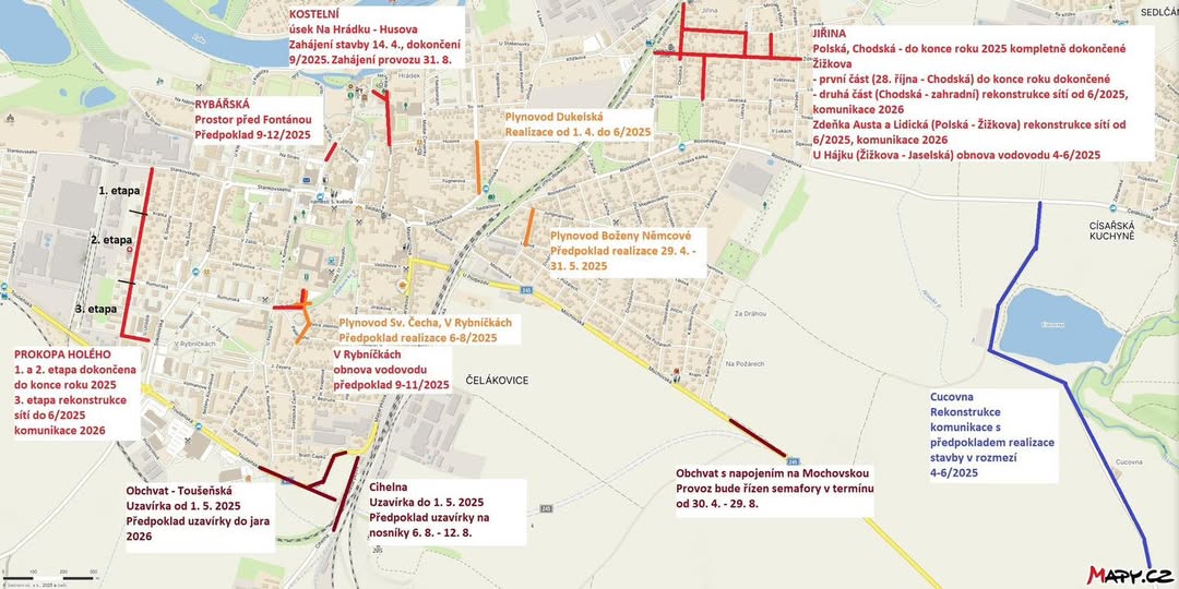 🚧 POZOR NA DOPRAVNÍ PEKLO 👹 Letos čekají Čelákovice mnohá dopravní omezení, která nám budou znepříjemňovat život. Prosíme moc o trpělivost a pochopení. Odměnou nám všem budou opravené silnice, nový obchvat a další rekonstruované ulice. Připravili jsme pro vás přehlednou mapku, kde jsou údaje platné k 25. 3. U některých staveb známe konkrétní data realizace, někde je to jen časové rozpětí, do kterého se stavba musí vejít. (fb)