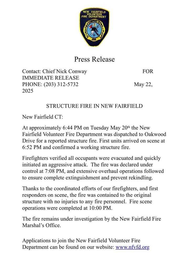 Press Release Contact: Chief Nick Conway FOR IMMEDIATE RELEASE PHONE: (203) 312-5732 May 22, 2025 STRUCTURE FIRE IN NEW FAIRFIELD New Fairfield CT: At approximately 6:44 PM on Tuesday May 20th the New Fairfield Volunteer Fire Department was dispatched to Oakwood Drive for a reported structure fire. First units arrived on scene at 6:52 PM and confirmed a working structure fire. Firefighters verified all occupants were evacuated and quickly initiated an aggressive attack. The fire was declared under control at 7:08 PM, and extensive overhaul operations followed to ensure complete extinguishment and prevent rekindling. Thanks to the coordinated efforts of our firefighters, and first responders on scene, the fire was contained to the original structure with no injuries to any fire personnel. Fire scene operations were completed at 10:00 PM. The fire remains under investigation by the New Fairfield Fire Marshal’s Office. Applications to join the New Fairfield Volunteer Fire Department can be found on our website: www.nfvfd.org (fb)