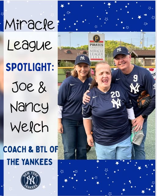 We would like to continue our staff recognition by spotlighting Nancy and Joe Welch, our awesome Yankees staff!! Nancy Welch is our Yankees Buddy Team Leader, and Joe Welch is our Yankees coach! Nancy and Joe Welch have been dedicated volunteers in the Miracle League since their daughter CaraLee joined early on—in the first or second season. What began as a family effort to support CaraLee has grown into a deep commitment, with Joe now coaching and Nancy serving as a Buddy Team Leader for the Yankees in the Adult Division. Baseball has always been at the heart of their household—both played as kids and now share their love of the game with CaraLee. Joe, originally from Upstate New York, is especially thrilled to represent his beloved Yankees in the league. No matter the kind of day anyone has had, when it is time to “Play Ball,” the Welches help bring joy, excitement, and community to the field. Thank you Joe and Nancy for all that you do for the Miracle League! We appreciate you guys!! 🎤💙🤍⚾️ (fb)