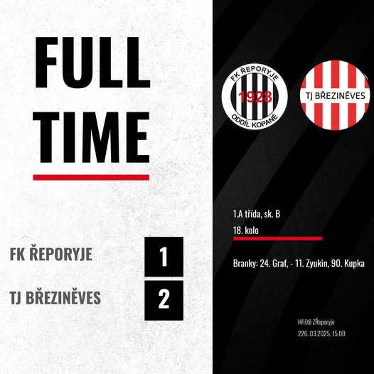 Řeporyje před zraky 160 diváků prohrály záchranářský duel s Březiněvsí a balancují tak nad propastí sestupu. Řeporyjský celek však čeká ještě 12 duelů, ve které bude chtít prokázat svojí kvalitu a zajistit si příslušnost v 1.A třídě. Děkujeme za Vaší podporu i v těchto časech, které se jistě brzy zlomí 🥁 (fb)