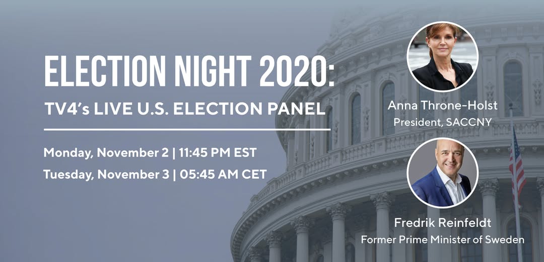 A reminder to join us on Election Night as SACCNY President, and 2016 U.S. Congress Candidate, Anna Throne-Holst shares her political insight during TV4's live election coverage. The live broadcast will start tonight at 11:45 PM EST and will be available globally. Tune in here: https://www.tv4play.se/program/live (fb)