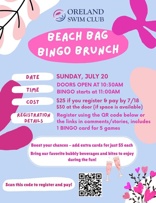 It’s time to register for OSC’s Beach Bag BINGO Brunch! Join us on Sunday, July 20 for a morning of BINGO, bonuses and big-time prizes to benefit the OSC Swim & Dive Team! Register using the links in comments and stories or by scanning the QR code! (fb)