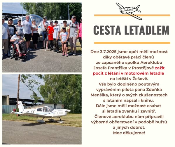 Dne 3.7.2025 jsme opět měli možnost díky obětavé práci členů ze zapsaného spolku Aeroklubu Josefa Františka v Prostějově zažít pocit z létání v motorovém letadle na letišti v Žešově. Vše bylo doplněno poutavým vyprávěním pilota pana Zdeňka Menšíka, který o svých zkušenostech s létáním napsal i knihu. Dále jsme měli možnost osahat si letadla zvenku i zevnitř. Členové aeroklubu nám připravili výborné občerstvení v podobě buřtů a jiných dobrot. Moc děkujeme! (fb)