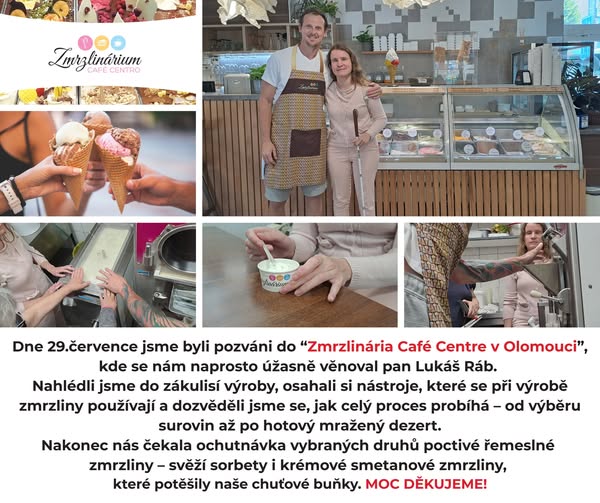 Dne 29.července jsme byli pozváni do “Zmrzlinária Café Centre v Olomouci”, kde se nám naprosto úžasně věnoval pan Lukáš Ráb. Nahlédli jsme do zákulisí výroby, osahali si nástroje, které se při výrobě zmrzliny používají a dozvěděli jsme se, jak celý proces probíhá – od výběru surovin až po hotový mražený dezert. Nakonec nás čekala ochutnávka vybraných druhů poctivé řemeslné zmrzliny – svěží sorbety i krémové smetanové zmrzliny, které potěšily naše chuťové buňky. MOC DĚKUJEME! (fb)