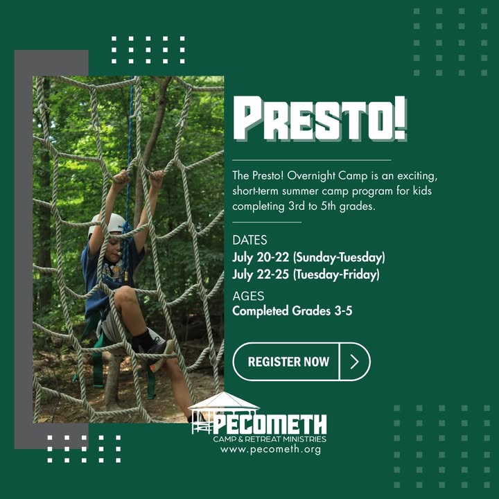 Ready for their first overnight camp experience? Presto! is the perfect fit for kids finishing grades 3–5. It’s a short and exciting introduction to camp life, filled with swimming, crafts, faith-filled fun, and all the classic moments that make camp special. Register now and start their camp journey. https://pecometh.org/presto/ (fb)