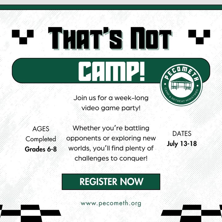 Gaming fans, this one’s for you. That’s NOT Camp is a unique program that blends the fun of video games with all the best parts of summer camp. Build community through shared gameplay, then unplug to swim, hike, and enjoy time outdoors. It’s a whole new way to experience camp. Sign up today and play your way through the week. https://pecometh.org/thats-not-camp/ (fb)
