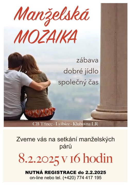 I letos vás zveme na sborové setkání manželských párů (bez rozdílu věku). Registrovat se předem kvůli zajištění občerstvení je nutné do 2. 2. na v pozvánce uvedeném tel. čísle nebo na formuláři zde https://forms.gle/Zb3HfFRT13945G8R8 . (fb)