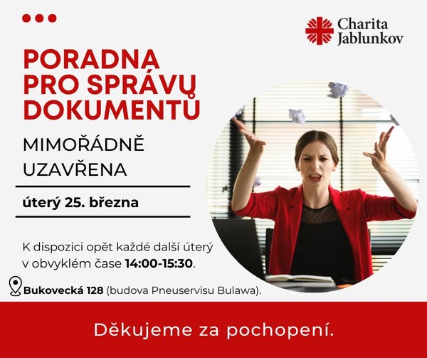 ℹ️Z důvodu nemoci bude DNES (úterý 25. března) PORADNA PRO SPRÁVU DOKUMENTŮ ⛔️uzavřena⛔️. Děkujeme za pochopení. K dispozici opět: 📇KAŽDÉ ÚTERÝ ⏰14:00-15:30 🏡BUKOVECKÁ 128 (budova Pneuservisu Bulawa) https://jablunkov.charita.cz/nase-sluzby/poradna-pro-spravu-dokumentu/ (fb)