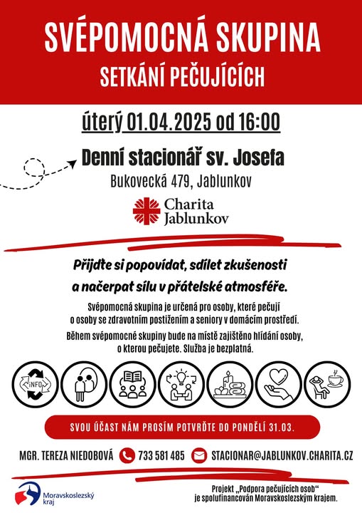 Každodenní starost o blízkého člověka🫂 je velice náročná a vyčerpávající. A to nejen fyzicky, ale také psychicky🆘. Často se objevují pocity zoufalství, beznaděje či osamělosti… Ale nemusíte na to být sami! Víme, jak ‼️důležité‼️ je nezapomínat také na sebe – mít možnost si na chvíli 💤odpočinout, 🗯podělit se o své zkušenosti, 🗣slyšet příběhy druhých. A právě proto i letos pokračujeme v 🤲setkávání pečujících. A budeme rádi, když se k nám připojíte. Hlídání osoby, o kterou pečujete, bude po celou dobu zajištěno. Nejbližší setkání se bude konat už příští týden: 📆úterý 1.dubna ⏰16:00 🏡Denní stacionář sv. Josefa (Bukovecká 479, suterén ZUŠ) Projekt "Podpora pečujících osob" je spolufinancován Moravskoslezským krajem". Děkujeme za důvěru🫶 https://jablunkov.charita.cz/aktualne/co-se-deje-u-nas/podpora-pro-pecujici-svepomocne-skupiny-u-nas-pokracuji-i-letos/ (fb)