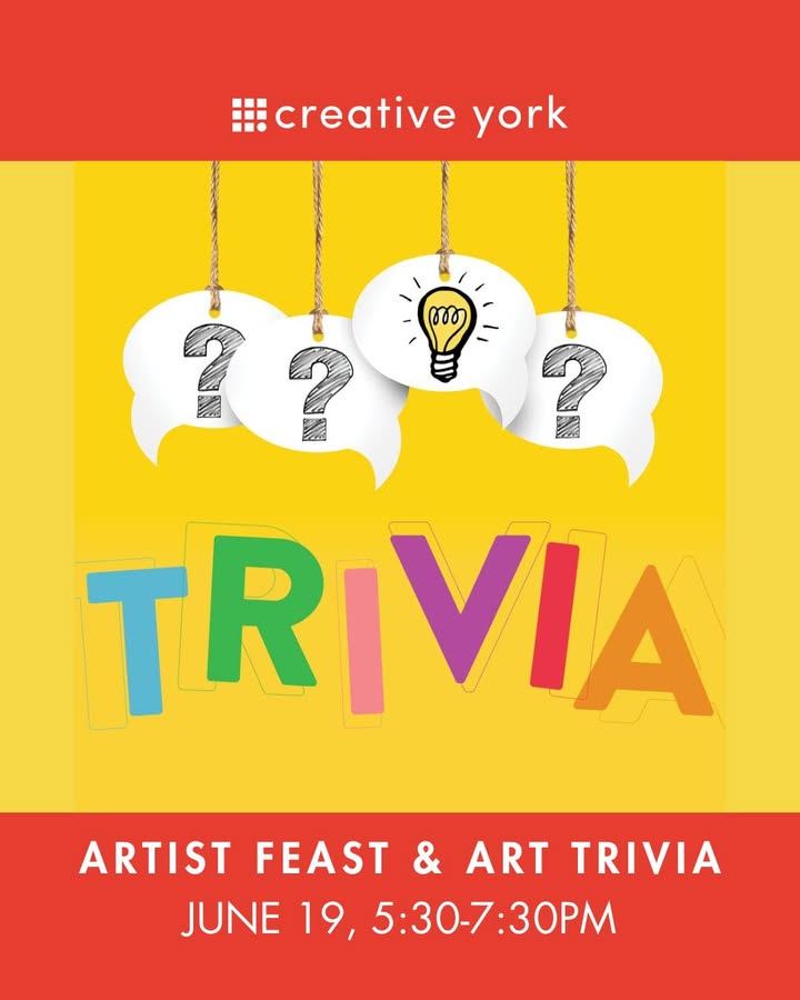 You are invited to our Artist Feast and Art Trivia Night on Thursday, June 19 from 5:30 to 7:30pm at Creative York! These gatherings are opportunities for artists and art enthusiasts to discuss their work and cultivate new friendships. This event is open to the public and FREE to attend. Art Trivia will start at 6pm. Get the scoop on our upcoming exhibits, share your arts-related news, learn about teaching opportunities at Creative York and so much more! Feel free to bring flyers, business cards and other promotional items to pass around. Please RSVP so we have an idea of how many people are coming, and feel free to share this event with your creative friends! LINK TO EVENT: https://www.facebook.com/events/1949780472225988/?acontext=%7B%22event_action_history%22%3A[%7B%22mechanism%22%3A%22your_upcoming_events_unit%22%2C%22surface%22%3A%22bookmark%22%7D]%2C%22ref_notif_type%22%3Anull%7D (fb)
