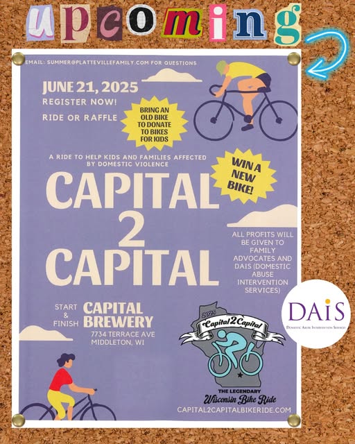 🚴♀️ Join us for the Capital 2 Capital Bike Ride on June 21, 2025, organized by Platteville Family Resource Center, Inc. to benefit DAIS!💜 Every mile you ride—and every raffle ticket you buy—helps support survivors and families impacted by domestic violence. 💥 Ride for a cause! 🍻 Stop by Capital Brewery for food, drinks, and a raffle! 🚲 Donate your old bikes for kids! Register today at: https://www.capital2capitalbikeride.com (fb)
