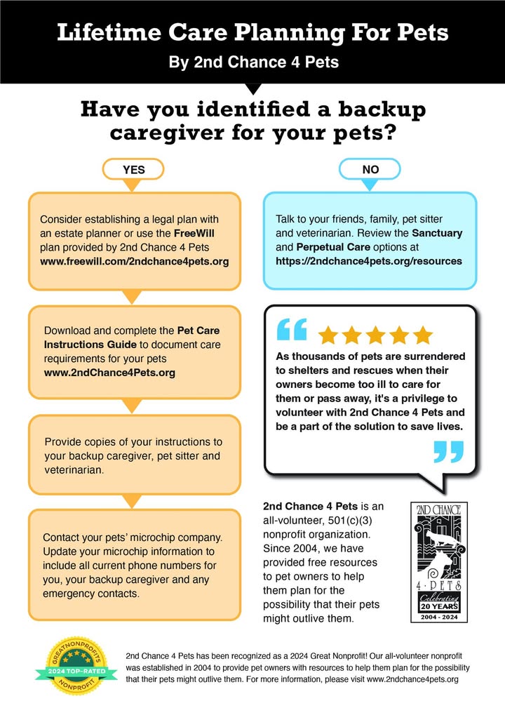 Good news for pet owners! Freewill had made arrangements so 2nd Chance 4 Pets can continue to cover the cost of their online will, legal in 50 states. This program is a very important tool for pet owners allowing them to plan for the possibility that their pets might outlive them. More than 500,000 pets are surrendered to shelters each year due to the death or disability of their owners who care for them. Since 2004, our all-volunteer team has provided free resources to help pet owners plan for their pets. Identify a backup caregiver and make sure you have a plan. For more information: www.2ndchance4pets.org (fb)