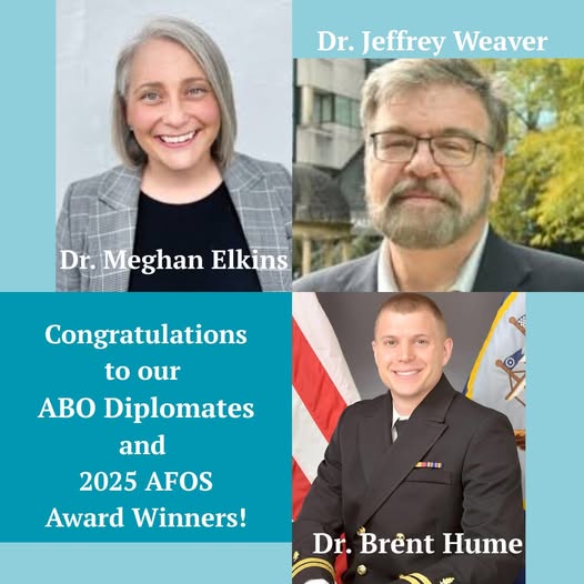 Congratulations to our ABO Diplomates who received the following awards at the AFOS Meeting in San Antonio, Texas! Dr. Meghan Elkins was named VA Optometrist of the Year and Overall Optometrist of the Year. Dr. Brent Hume was named Resident of the Year. Dr. Jeffrey Weaver received the Orion Award. (fb)