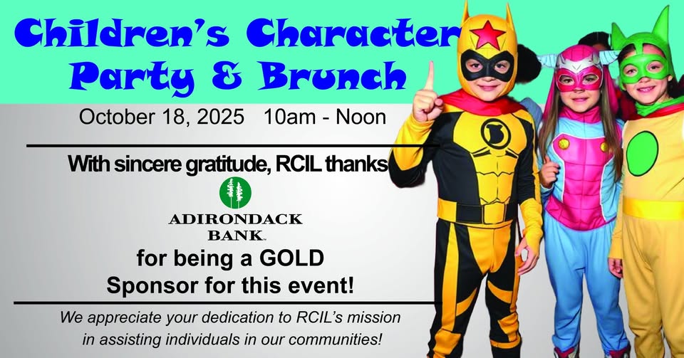 Children's Character Party October 18, 2025, 10am - Noon With sincere gratitude, RCIL thanks Adirondack Bank for being a gold sponsor of this event! We appreciate you dedication to RCIL's mission in assisting individuals in our communities! (fb)