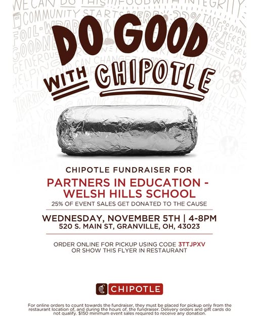 Mark your calendar! One week from TODAY! Please join us on Wednesday, November 5, from 4–8 p.m. at Chipotle in Granville. Show this flyer, mention our fundraiser at checkout, or use code 3TTJPXV when ordering online for pickup, and 25% of your purchase will be donated back to our school! 🙌 Valid only at the Chipotle in Granville at 520 S. Main Street. Thank you for supporting our mission to "...build life-long learners, creative problem solvers, and compassionate, responsible individuals who are respectful global citizens." #welshhillsschool (fb)