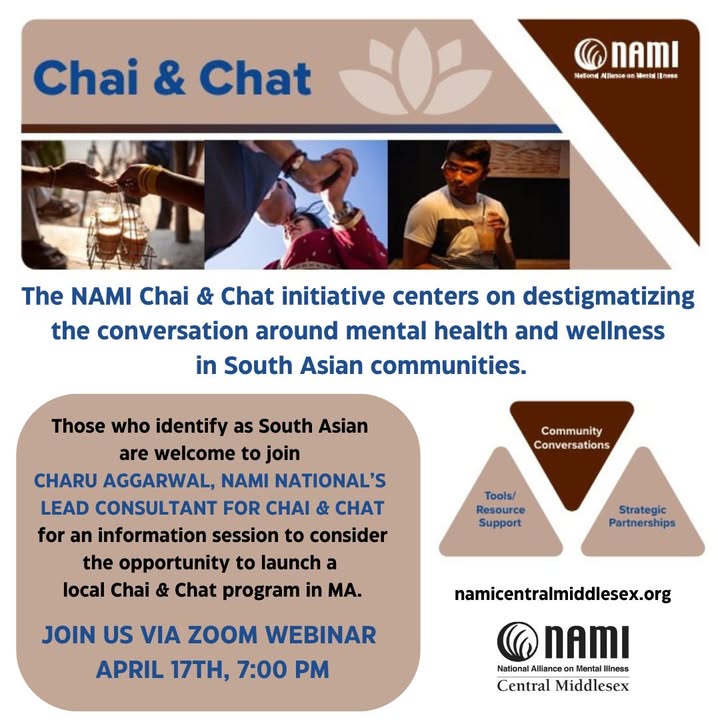 Spread the word about our 4/17 webinar: a mental wellness opportunity for the South Asian community. Learn more & register: https://www.namicentralmiddlesex.org/newsletter/chai-chat-intro (fb)
