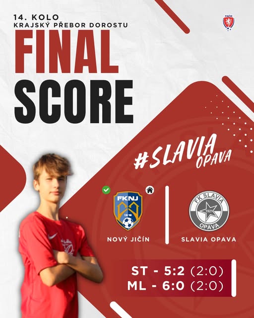 Dorost o víkendu nebodoval 😢 Obě kategorie soupeři z vrchních pater tabulky podlehli a neodvezli si tak ani jeden bod 🔴⚪️ 🏆 14. kolo - KALMAN TRADE Krajský přebor starší dorost ❌ FK Nový Jičín 🆚️ FK Slavia Opava 5:2 (2:0) ⚽️ Góly: Schwarz 1', Mička 4'+62', Pospěch 60', Teichmann 71' - Pogats 57', Matýsek 90' 👥️ Sestava: Demchuk, Bosák (Sochor 89'), Fuchsig, Matýsek, Pogats, Schuster, Šejda, J. Vašíček, P. Vašíček (Volný 76'), Zapletal, Šmarda (Müller 64') 🏆 14. kolo - KALMAN TRADE Krajský přebor mladší dorost ❌ FK Nový Jičín 🆚️ FK Slavia Opava 6:0 (2:0) ⚽️ Polach 27'+40'+42'+53'+57', Kadlec 59' 👥️ Sestava: Unucka, Volný, Feilhauer, Pobořil, Schuster, Pěruška, Janeček, Müller, Křesťan, Zapletal, Šejda, Fuchsig, Gola, Sochor, Reger, J. Vašíček, Pogats, Matýsek #fkslaviaopava #fkslaviaopavamladez #fkslaviaopavadorost (fb)