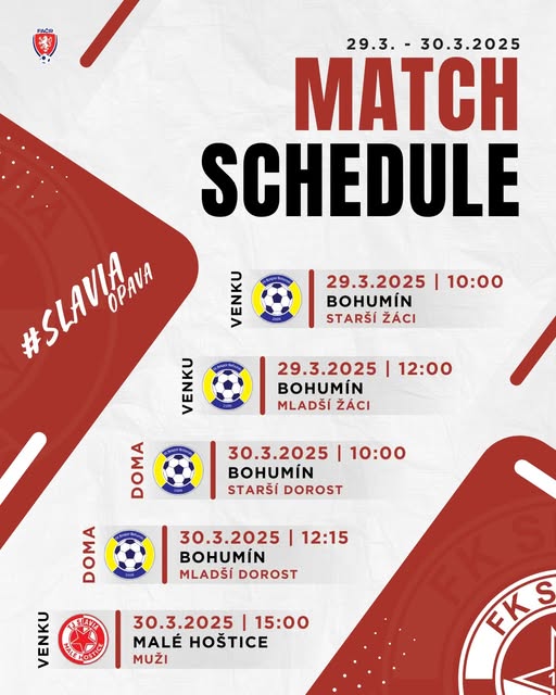 Tento víkend jdou do boje kromě mužů a dorostenců konečně taky žáci🔥 Ti se představí v sobotu jako první ze všech kategorií v Bohumíně a stejný soupeř bude čekat i na náš dorost o den později v provizorním azylu v Chlebičově. 💯 Muži celý víkend zakončí ve slávistickém derby s Malými Hošticemi. Mějte prosím na paměti, že i přes to, že budou vedeni v zápise jako domácí, tak se zápas odehraje na půdě Malých Hoštic! 🔴⚪️ 🏆 14. kolo - POHÁRY BAUER Krajský přebor žáci 🆚️ FK Bospor Bohumín 📆 sobota 29.3.2025 🕛 starší žáci 10:00 | mladší žáci 12:00 🏟 fotbalové hřiště Bohumín 🏆 15. kolo - KALMAN TRADE Krajský přebor dorost 🆚️ FK Bospor Bohumín 📆 neděle 30.3.2025 🕛 starší dorost 10:00 | mladší dorost 12:15 🏟 fotbalové hřiště Chlebičov 🏆 15. kolo - CANIS 1.B třída mužů sk. A 🆚️ TJ Slavia Malé Hoštice 📆 neděle 30.3.2025 🕛 15:00 🏟 fotbalové hřiště Malé Hoštice #fkslaviaopava #fkslaviaopavamladez #fkslaviaopavamuzi #fkslaviaopavadorost #fkslaviaopavazaci (fb)