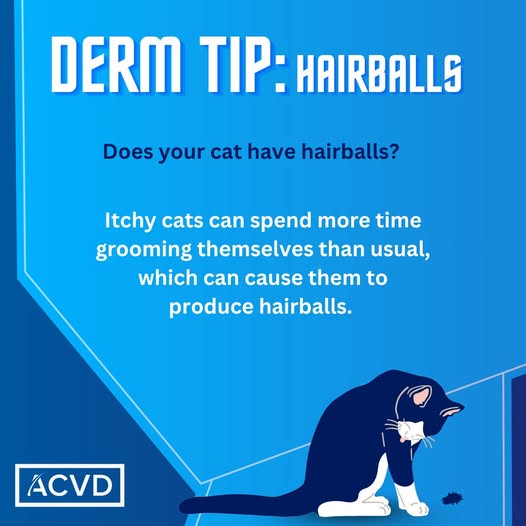 #DYK hairballs can be caused by cats excessive grooming? Cats regularly clean themselves with their tongue and can ingest some hair, but especially itchy cats that spend more time grooming than usual can create hairballs. If you think that your pet may be unusually itchy, they may have allergies. Talk with your vet and see if they suggest seeing a specialist like an ACVD Board Certified Veterinary Dermatologist. #ACVD #catsofinstagram #hairballs #petcare #veterinary #dermatology #grooming (fb)