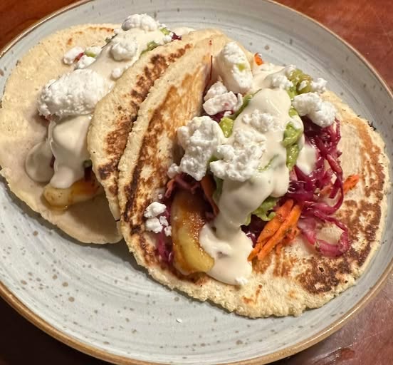 It’s What’s Cooking Wednesday, and we’re whipping up some Baja-inspired “shrimp” tacos, using Vegetarian Incorporated vegan “shrimp”! We found a non-vegan recipe, and just replaced the shrimp, sour cream, mayo and cotija cheese with vegan versions—there’s not much that can’t be deliciously veganized! Ingredients: “Shrimp” Taco Sauce Ingredients: * 1/3 cup Forager vegan sour cream * 1/3 cup vegan mayonnaise * 1 1/2 Tbsp lime juice, squeezed from 1 medium lime * 3/4 tsp garlic powder * 3/4 tsp Sriracha sauce, or to taste “Shrimp” Taco Toppings: * 8 white corn tortillas, (small, 6” diameter) * 1/2 small purple cabbage, 2 cups shredded * 1 large avocado, pitted, peeled, and diced * 1/2 red onion, diced * 4 oz Follow Your Heart vegan feta * 1/4 bunch cilantro, coarsely chopped * 1 lime , cut into 8 wedges For the “Shrimp”: * 1 lb All Vegetarian Incorporated vegan “shrimp” * 1 garlic clove, pressed or minced * 1/2 tsp sea salt * 1/4 tsp black pepper * 1/4 tsp ground cumin * 1/4 tsp cayenne pepper * 1 Tbsp olive oil Instructions: * Make the “Shrimp” Taco Sauce - In a small bowl, whisk together the sauce ingredients and set aside for the flavors to meld. Transfer to a squeeze bottle if desired. * Prep the Toppings - Thinly slice cabbage, dice the avocado, finely dice the red onion, and coarsely chop the cilantro. Arrange toppings in small bowls for easy serving. * Season the “Shrimp” - Thaw and pat dry the “shrimp” with paper towels and place in a medium bowl. Add seasonings and garlic and stir to combine. * Cook the “Shrimp” - Place a large non-stick pan over medium-high heat. Add 1 Tbsp olive oil and add “shrimp” in a single layer. Sauté 1-2 minutes per side or just until cooked through. Set aside to cool. * Heat the Tortillas - You can toast the tortillas over a gas flame, on a griddle or in a skillet. * To Serve - Build tacos by arranging toppings and “shrimp” over each toasted tortilla. Serve drizzled with the taco sauce. What are you cooking up tonight? (fb)