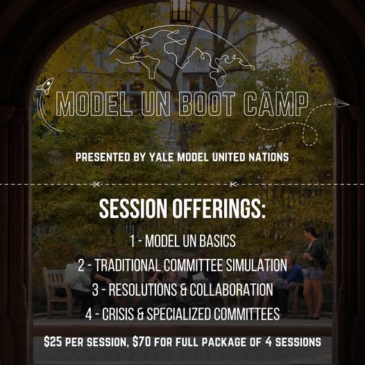 🌍 Unlock Your Model UN Potential with our MODEL UN BOOT CAMP! 🌍 Ready to dive into the world of Model UN? Whether you’re a beginner or looking to level up your skills, our interactive sessions have something for you! 💡 Session 1: Model UN Basics Get started with the foundational concepts of Model UN. Learn how MUN committees work through engaging activities and expert instruction. 💼 Session 2: Traditional Committee Simulation Experience a live MUN committee simulation! Understand parliamentary procedure and engage in a hands-on committee experience. 📝 Session 3: Resolutions & Collaboration Master the art of resolution drafting and teamwork in this in-depth session. Collaborate with fellow delegates and improve your MUN skills! 🔥 Session 4: Crisis & Specialized Committees Step into the complex world of Crisis and Specialized Committees! Learn how these dynamic sessions unfold and prepare for fast-paced decision-making. Full package of all 4 sessions also available at a discounted rate! Why join? Live, interactive sessions with Yale MUN staff Develop essential MUN skills like debate, resolution drafting, and teamwork Build confidence for your next MUN conference Our first round of sessions will run from December 19th to December 22nd, and the second round will run from December 28th to January 8th! 🌟 Limited spots available – sign up today and take your MUN skills to the next level! 🌟 Available at yira.org, then navigate to “store” (fb)