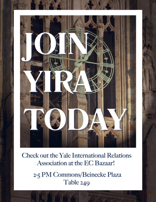 🌎 JOIN YIRA TODAY 🌎 Check out the Yale International Relations Association, the largest student organization at Yale, at Table 249 at the EC Bazaar! (fb)