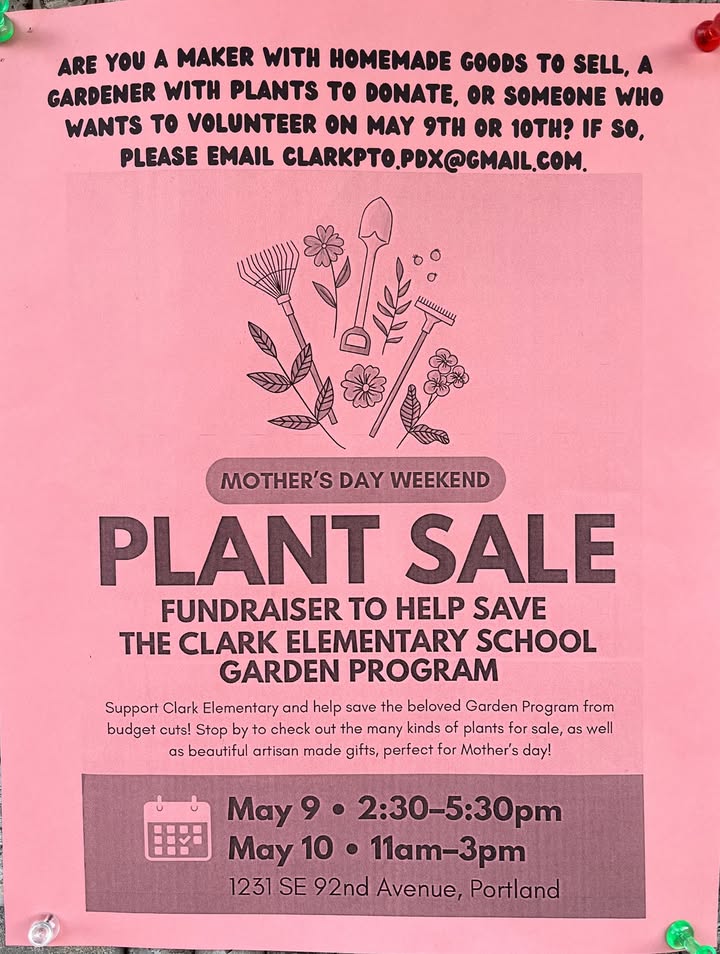Clark Elementary School needs your support! Come to their plant sale THIS FRIDAY AND SATURDAY, May 9th and 10th. Support Clark's ability to continue hosting Grow Portland's programming next year! 1231 SE 92nd Ave Do you have extra plant starts you can donate to their plant sale? Email clarkpto.pdx@gmail.com to coordinate donation! And share this flier with your networks! Thanks for your support. (fb)