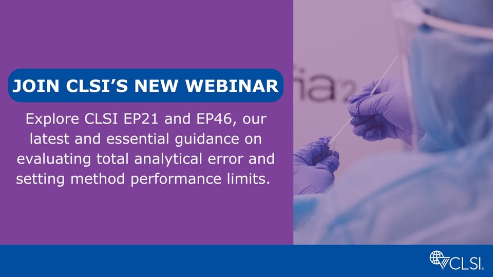 You're invited! Join CLSI's new webinar that explores CLSI EP21 and EP46. This webinar is our latest and essential guidance on evaluating total analytical error and setting method performance limits. Whether you're a method developer or an end-user medical laboratory, this webinar will help you apply these concepts with clarity and confidence. More info here >> https://hubs.la/Q03zCFdf0 (fb)