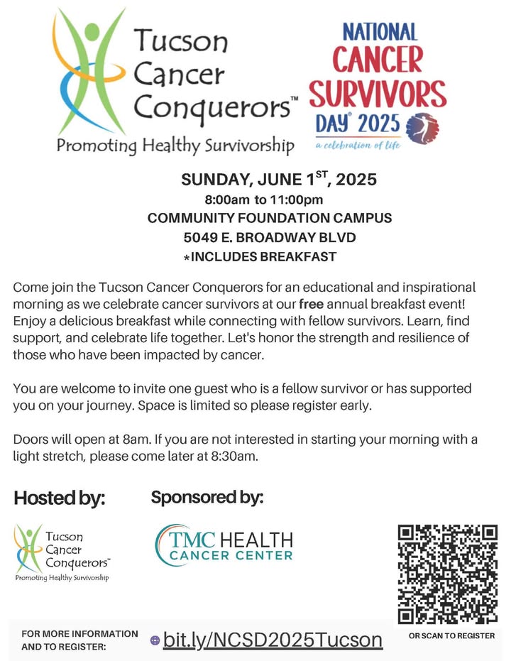 Tucson Cancer Conquerors, National Cancer Survivor Day 2025! Sunday June 1st 2025 8 am to 11 pm at Community Foundation Campus Located at 5049 E Broadway Blvd. Breakfast is included. (fb)