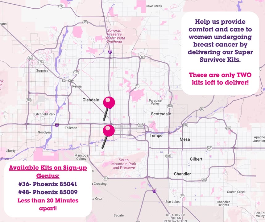 Attention all CFAL volunteers! There are only two women left available to deliver our Super Survivor Kits to. Both of the women are in Phoenix and are less than 20 minutes apart from each other. The pins on the map above are the general areas of the Super Survivors you would be delivering to. With your help, we can make a difference in a woman's breast cancer treatment by providing comfort and care to them when they are In need. Visit our website checkforalump.org for more information and updates on volunteer opportunities. (fb)