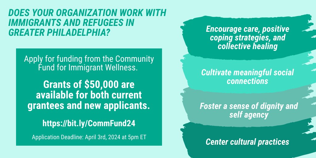 The Community Fund for Immigrant Wellness is seeking applications for its fifth cycle of grantmaking to support organizations that remove barriers and provide opportunities for individuals to live with dignity and joy. Organizations can apply for up to $50,000 to support the emotional health and wellbeing of immigrant and refugee communities. The funding is flexible and should be used to support programs that: -Create opportunities with immigrant communities to encourage care, positive coping strategies, and collective healing -Build spaces that cultivate meaningful connections among community members -Foster a sense of dignity and self-agency -Center cultural practices of participants Applications are due Wednesday, April 3rd, 2024 at 5pm ET. Participate in this unique, community-driven approach to grantmaking today! https://bit.ly/CommFund24 (fb)
