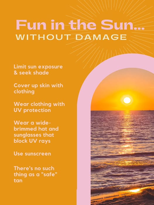 August is Summer Sun Safety Month and with summer in full swing we wanted to share some resources and helpful information. To protect yourself: Seek shade, especially during midday hours Protect skin by covering it with clothing Consider investing in clothing with UV protection (UV protection factor) Wear a wide-brimmed hat to protect your head, face, and neck Wear sunglasses that block UV rays to protect your eyes and the skin around them Use sunscreen with at least SPF 30 to help protect any skin that is not covered Reapply sunscreen at least every 2 hours, and more frequently if you are swimming or sweating Source: American Cancer Society For more information visit the links below: https://www.cancer.org/cancer/risk-prevention/sun-and-uv.html https://www.weather.gov/safety/heat-uv https://www.cdc.gov/skin-cancer/sun-safety/index.html (fb)