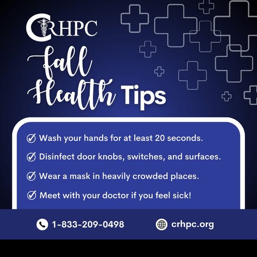 Need some helpful tips to avoid getting sick this fall? Here are a few thoughtful actions to keep in mind as you navigate the sick season. 👏 Wash your hands frequently for at least 20 seconds. 🧼 Disinfect all door knobs, light switches, and surfaces in your home. 🤧 Wear a mask when going to densly crowded places. 🩺 If you feel sick, schedule an appointment with CRHPC! 1-833-209-0498 crhpc.org #crhpc #NACHC (fb)