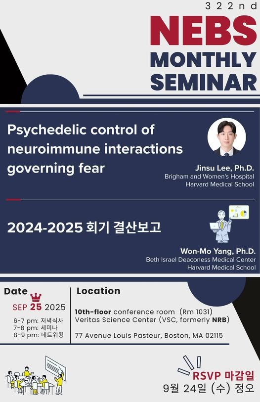 ■Presentation 이진수 박사님 (Jinsu Lee, Ph.D., Brigham and Women's Hospital/Harvard Medical School) Psychedelic control of neuroimmune interactions governing fear 양원모 박사님 (Won-Mo Yang, Ph.D., Beth Israel Deaconess Medical Center/ Harvard Medical School) 2024-2025 회기 결산보고 ■Date & Location 2025년 9월 25일 (목) 6:00 PM - 7:00 PM 저녁식사 7:00 PM - 8:00 PM 세미나 8:00 PM - 9:00 PM 네트워킹 10th-floor conference room (Room 1031), *Veritas Science Center (VSC), 77 Avenue Louis Pasteur, Boston, MA 02115 *New Research Building (NRB) Renamed as Veritas Science Center (VSC) *NRB가 VSC로 건물이름이 변경되었습니다 (Sep.3.2025) https://hms.harvard.edu/news/new-research-building-renamed-veritas-science-center ■RSVP https://docs.google.com/forms/d/e/1FAIpQLSc4bNpNoLiOqC774EcWa9FKlLVqxQdBxD4uQrCKQaDibAKFUA/viewform RSVP 마감일: 9월 24일 (수) 정오 ■NEBS Spouse Social Network NEBS 배우자 소셜 네트워크에 대해 안내드립니다. 기혼이신 회원님께서는 가족(배우자 및 자녀)과 함께 Monthly Seminar에 참석하시어 저녁 식사를 함께 즐기실 수 있습니다. 세미나가 진행되는 동안에는 배우자분들께서 서로 편안하게 소셜 네트워킹을 즐기실 수 있도록 별도의 공간을 마련할 예정입니다. 배우자분께서 회원님과 함께 세미나에 참여하셔도 무방하오니 많은 관심과 참여 부탁드립니다. ■Entrance Information 원활한 건물 출입을 위해 RSVP를 해주시길 부탁드리며, 가능한 7시이전에 출입해주시면 감사드리겠습니다. 7시 이후에 출입하셔야 하는 경우는 RSVP를 하셨더라도 / 하버드ID를 소지하셨어도 security에서 출입을 도와줄 수 없다고 하니,번거로우시더라도 아래 주소의 임원진에게 연락 부탁드립니다. PR팀 (pr@nebskorea.com) SCIENCE 팀 (science@nebskorea.com) ■Parking Information 차량을 이용하시는 분들은 375 Longwood Ave에 위치한 주차장을 이용하시고, 주차권을 임원진에게 요청해주시기 바랍니다. 구글맵에 375 Longwood Parking Garage를 검색하시면, 350 Longwood Ave에 위치한 Longwood Galleria Garage로 잘 못 안내하는 경우가 많다고 하니, 주차장 주소를 꼭 확인하시어 이용에 불편 없으시길 바랍니다. (fb)