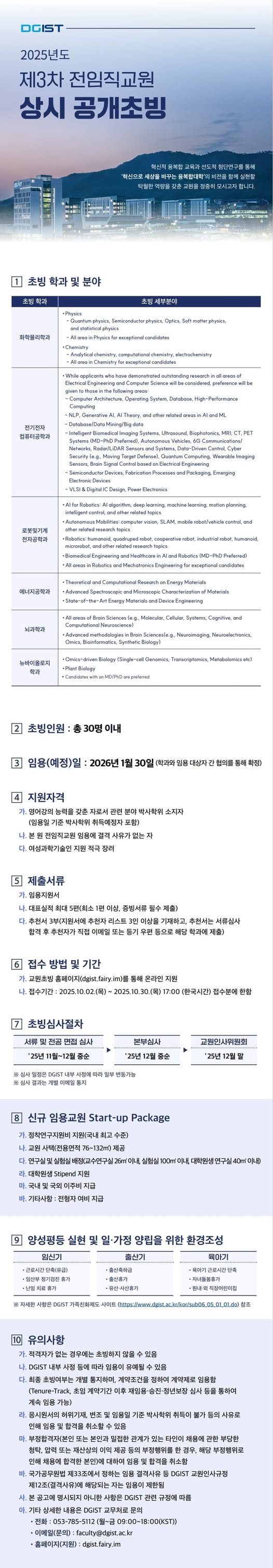 2025년도 DGIST (대구경북과학기술원) 전임직교원 상시 공개초빙 「2025년도 제3차 전임직교원 상시 공개초빙」공고를 진행하고 있습니다. 많은 지원 바랍니다. - 접수기간 : 2025. 10. 2.(목) ~ 2025. 10. 30.(목) 17시까지(한국시간) - 지원사이트 : https://dgist.fairy.im (fb)