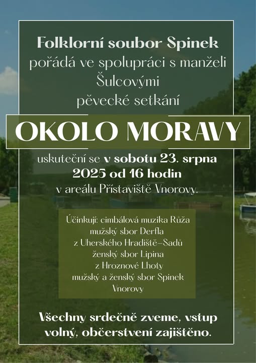 Tady je trochu fotek ze sobotní akce na přístavišti ve Znorovách, která se podle nás natolik vydařila, že bysme v tomto prostředí chtěli pokračovat aj v dalších rokoch. Snáď nám budú okolnosti přát, protože idú nejaké informace o budoucí stavbě lávky přes Moravu a rekonstrukci plavební komory, tak uvidíme ... Chtěli bysme tímto poděkovat samozřejmě Vám divákům za účast, dále potom manželům Šulcovým Baťův kanál, Vnorovy-přístav plný pohody za to, že nás pustili do tak pěkného prostředí, cimbálové muzice Cimbálová muzika Růža, děvčatom z ŽS Lipina z Hroznové Lhoty a chlapom z Mužský sbor JMF Derfla z Uherského Hradiště Sadů. DÍKY. Za fotky poděkování Víťovi Macháčkovi (fb)