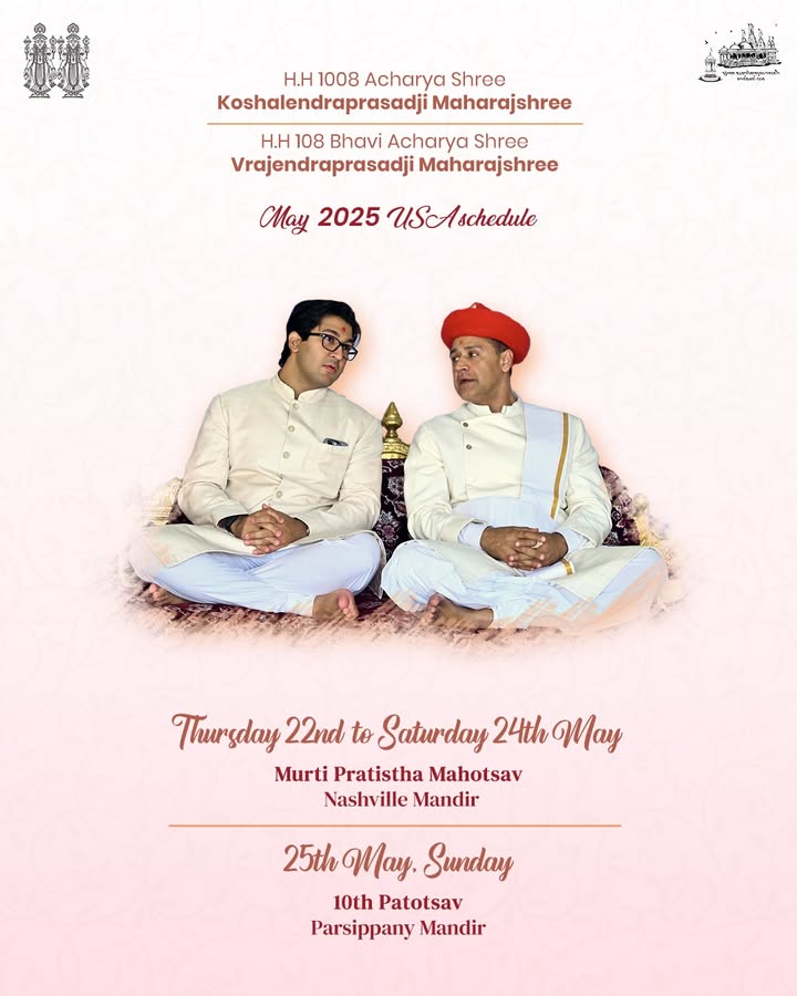 Get ready, USA! We are incredibly honored to announce the auspicious visit of H.H. 1008 Acharya Shree Koshalendraprasadji Maharajshree and H.H. 108 Bhavi Acharya Shree Vrajendraprasadji Maharajshree! Join us for the divine Nashville Mandir Murti Pratistha Mahotsav and the joyous Parsippany 10th Patotsav, commemorating a decade of spiritual devotion and community in New Jersey. Don't miss this rare opportunity to receive the blessings and darshan of our Acharyas. (fb)