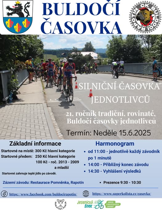 BULDOČÍ ČASOVKA 15. 6. A v neděli 15. 6. je na řadě silniční časovka jednotlivců v Rapotíně. Přihlašování předem bude spuštěno od 9. 6. Veškeré info zde: https://www.superkolista.cz/casovka/ (fb)
