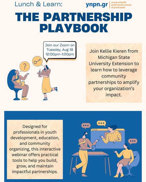 ⏰ Don’t forget! Our Lunch & Learn: The Partnership Playbook is happening Tuesday, August 19 from 12–1pm on Zoom. 📘 Come learn practical strategies to build, strengthen, and sustain community partnerships! 👉 RSVP here: https://forms.office.com/r/2v9Pz24ddY 🔗 Zoom link: https://msu.zoom.us/j/91519422573?pwd=d5Iz7JU28MEDCwkLrMCWQjNs18UDTL.1 (Passcode: partner) Hosted by Kellie Kieren, Michigan State University Extension. Let’s connect, collaborate, and grow our impact! 💡 #ProfessionalDevelopment #LeadershipDevelopment #partnerships #lunchandlearn #nonprofit #ynpngr (fb)