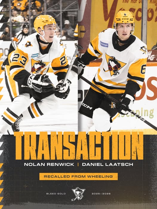 Nolan Renwick and Daniel Laatsch are joining the Penguins after being recalled from the Wheeling Nailers. https://www.wbspenguins.com/renwick-and-laatsch-recalled-from-wheeling/ (fb)