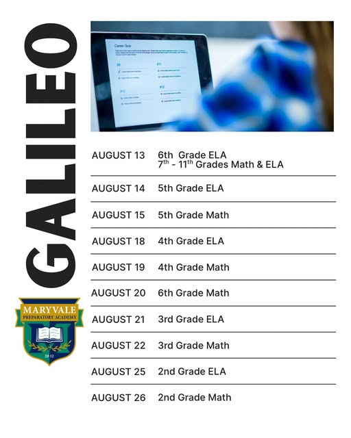 Our 2nd through 11th Grade scholars will be taking the first Galileo Benchmark assessment. This is the first step in preparing our scholars for the State Testing in the spring! Be sure to get a good night’s sleep and have a good breakfast on your testing day. Nuestros alumnos de 2º a 11º grado tomarán la primera evaluación Galileo Benchmark. Este es el primer paso en la preparación de nuestros estudiantes para los exámenes del estado en la primavera. Asegúrense de dormir bien y desayunar bien el día del examen. (fb)