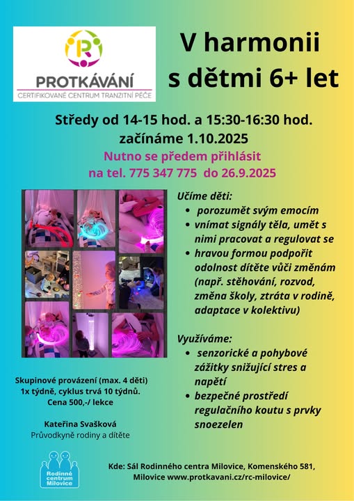 I v tomto školním roce pokračujeme V harmonii 🫂 Program 'V harmonii' se zaměřuje na rozvoj emocí a odolnosti dětí ve věku 6 a více let. Od 1. října 2025 se koná každou středu v Rodinném centru Milovice. Děti se zde naučí porozumět vlastním emocím, vnímat signály těla a regulovat se. Program podporuje odolnost vůči změnám, jako je stěhování, rozvod nebo adaptace v kolektivu. Program je veden v bezpečném prostředí regulačního koutu s prvky snoezelen. Senzorické a pohybové zážitky pomáhají snižovat stres a napětí. ❣️Je nutné se předem přihlásit do 26. září 2025 na telefonním čísle 775 347 775. (fb)