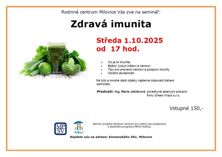 Seminář na téma zdravá imunita. Poradkyně zelených potravin z firmy Green Ways, vám přinese cenné informace o imunitě, běžném výskytu infekcí a nemocí, a také tipy na prevenci a posílení vaší imunity. 🍀🥦🥬🫑🥒 (fb)