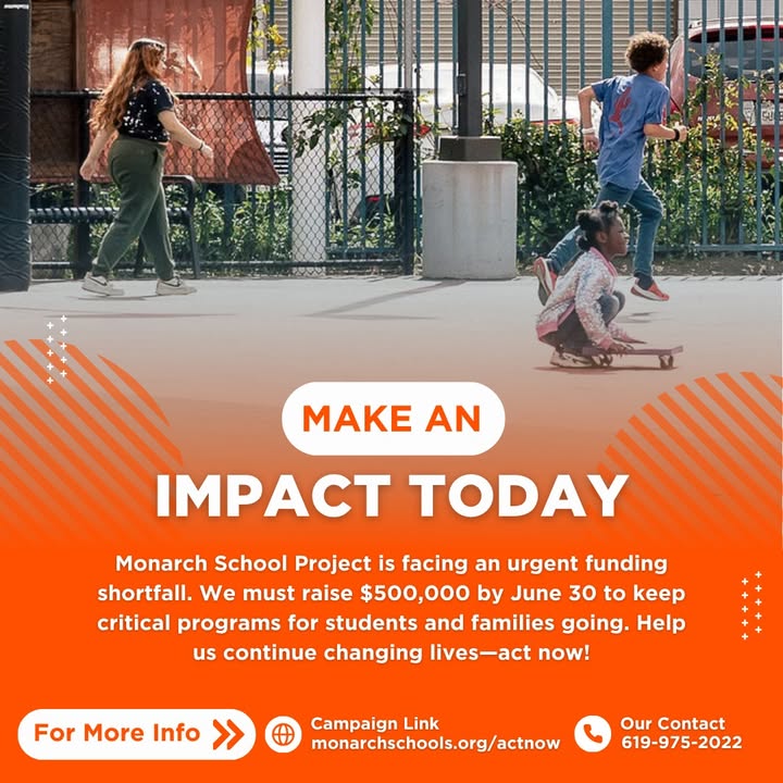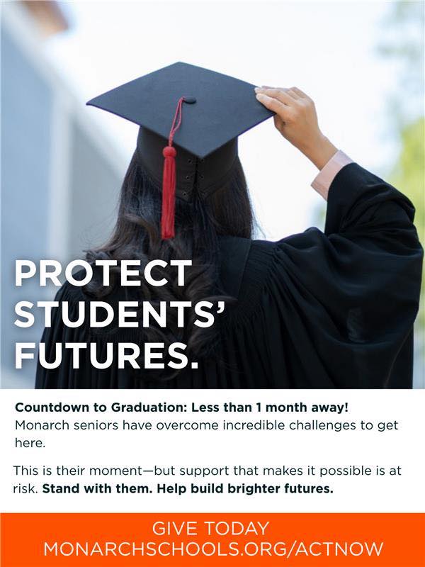 🎓 The countdown is on—less than 1 month until Monarch seniors graduate! They’ve shown resilience, strength, and determination. Now, it’s their moment. 💪✨ But the support that got them here is at risk. 💛 Stand with our students. Help them keep building their futures: monarchschools.org/actnow #ActNowForMonarch #StandWithMonarch #SocialImpact #SupportYouth #SanDiegoNonprofit #EducationForAll #MonarchSchoolProject (fb)