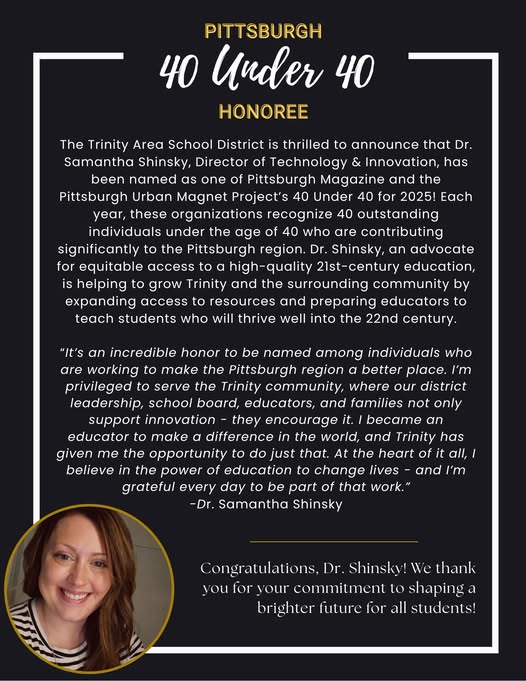 Congratulations to Dr. Samantha Shinsky on being named a Pittsburgh 40 Under 40 honoree! https://www.pittsburghmagazine.com/40-under-40-honorees/ (fb)