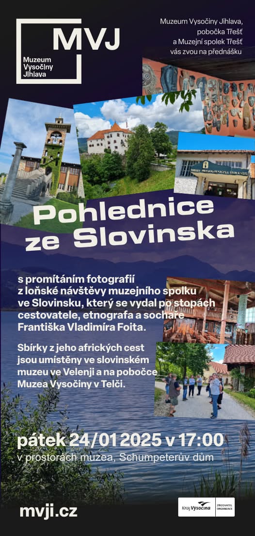 Zveme vás na promítání fotografii z loňské návštěvy Muzejního spolku ve Slovinsku, který se vydal po stopách cestovatele, etnografa a sochaře Františka Vladimíra Foita. Sbírky z jeho afrických cest jsou umístěny ve slovinském muzeu ve Velenji a na pobočce Muzea Vysočiny v Telči. Mládí a dětství Foit prožil v nedalekém Doupí. Promítání bude komentovat V. Budař. Tento pátek 24.1.2025 v 17.00 hod. v třešťském muzeu. (fb)