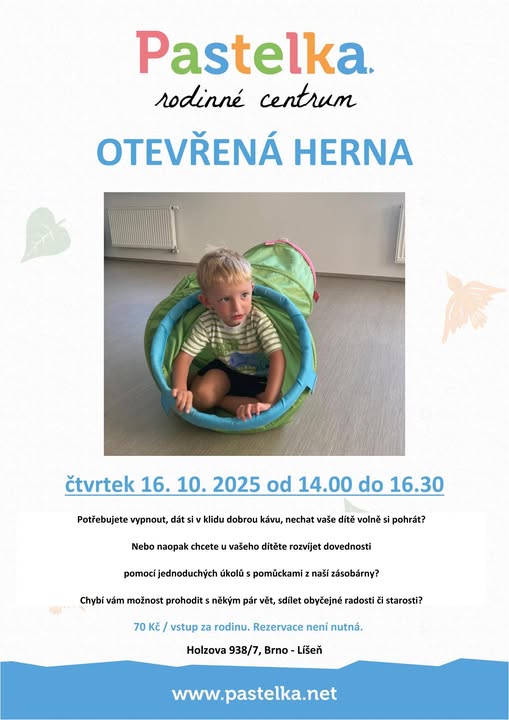 Rozvíjíme děti, pomáháme rodičům Ahoj a dobrý den. Jsme rodinné centrum v Brně-Líšni. Rozvíjíme talent a zájmy dětí od narození až po druhý stupeň ZŠ. Maminkám a tatínkům poskytujeme prostor pro aktivní odpočinek, práci nebo volný čas pro sebe.