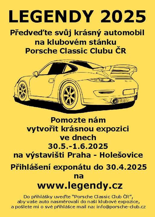 Pomozte nám připravit krásnou a zajímavou expozici automobilů Porsche na velké motoristické výstavě LEGENDY. Více informací najdete na www.porsche-club.cz (fb)