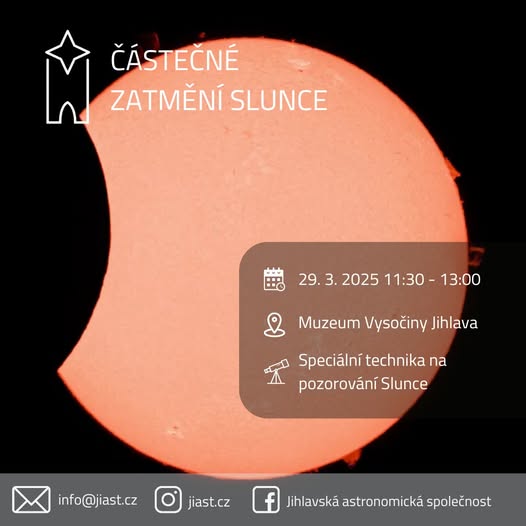 V sobotu nás čeká zatmění Slunce, které budeme moci pozorovat i z Jihlavy. Za příznivých podmínek budeme se speciální technikou před Muzeum Vysočiny Jihlava, tak se za námi přijďte podívat! 🔭🌞 (fb)