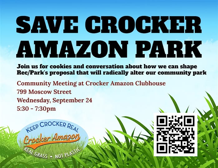 Join "Keep Crocker Real" for cookies and conversation about San Francisco Rec & Park's radical proposal to transform Crocker Amazon Park. When: Wednesday, September 24, 2025 / 5:30PM - 7:30PM Where: Crocker Amazon Playground RSVP here: https://www.eventbrite.com/e/save-crocker-amazon-park-cookie-social-tickets-1696266371379?utm-campaign=social&utm-content=attendeeshare&utm-medium=discovery&utm-term=listing&utm-source=cp&aff=ebdsshcopyurl (fb)